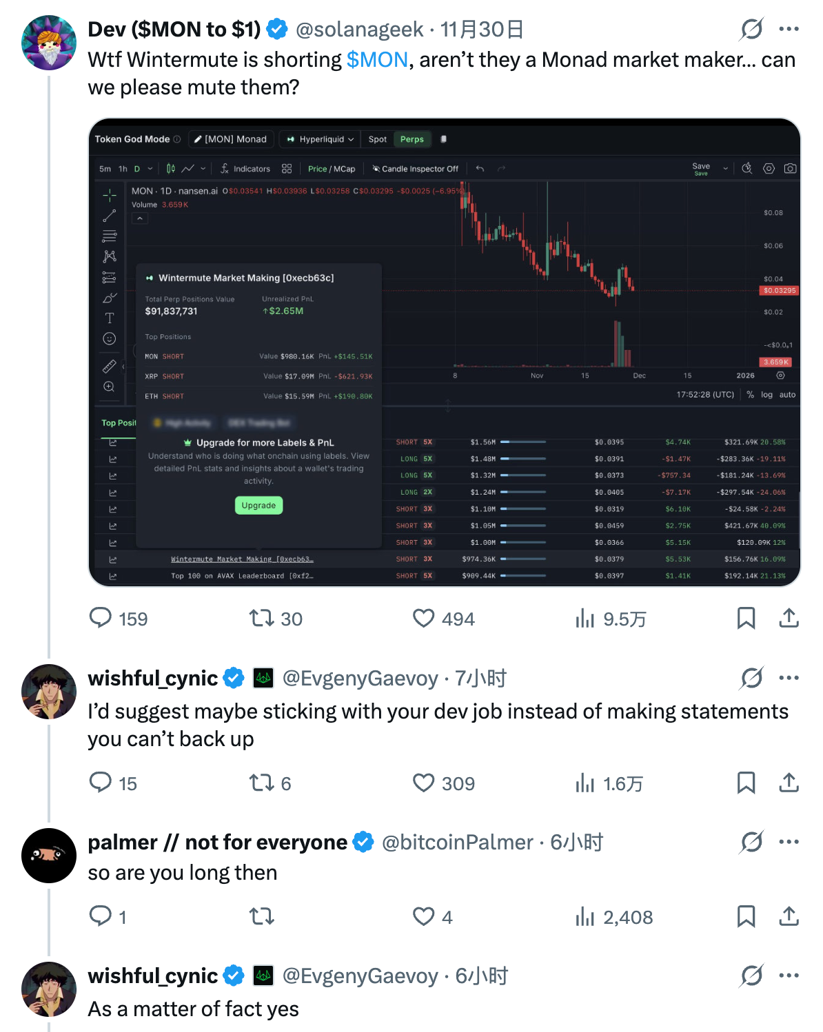 According to Odaily Planet Daily, in response to allegations from Monad ecosystem developers that Wintermute, as a market maker, is shorting MON, Wintermute founder Evgeny Gaevoy refuted the claims, stating, "Don't make statements that cannot be verified."