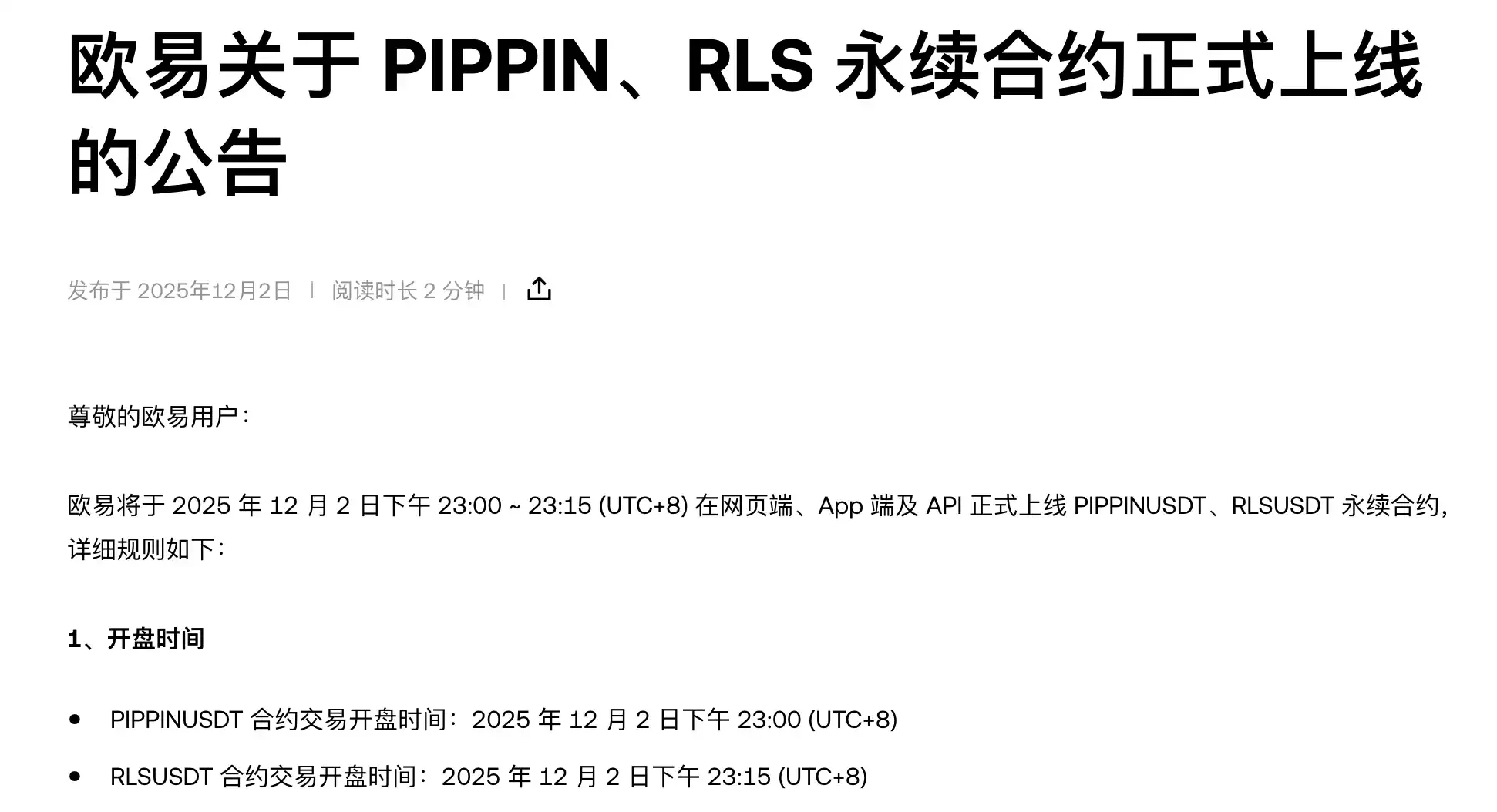According to official news, OKX will officially launch PIPPINUSDT and RLSUSDT perpetual contracts on its website, app, and API from 23:00 to 23:15 (UTC+8) on December 2, 2025.