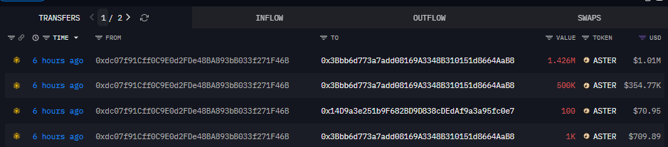 A whale deposited 1.926 million ASTER tokens into a CEX; if it were to sell them, it could lose $600,000.