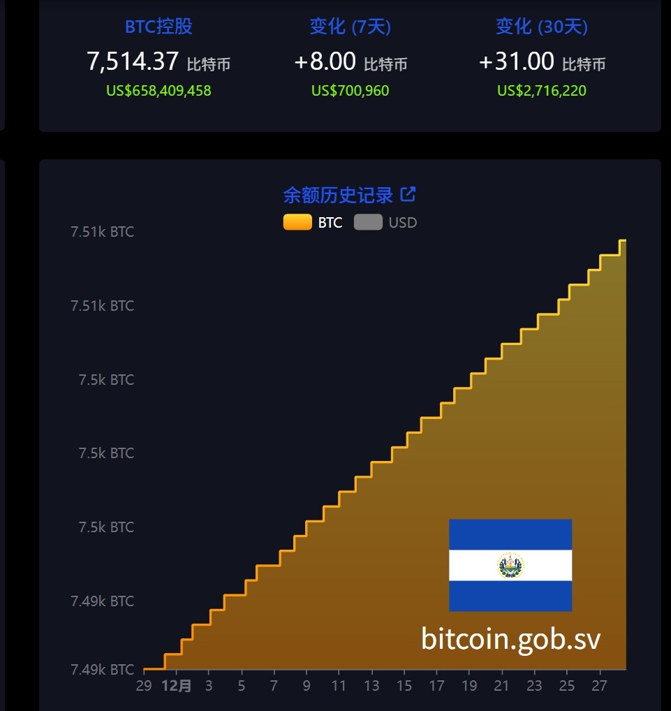 According to Odaily Planet Daily, the Salvadoran government has acquired 8 Bitcoins in the past 7 days and 31 Bitcoins in the past 30 days, bringing its total Bitcoin holdings to 7,514.37, with a total value of $658 million.