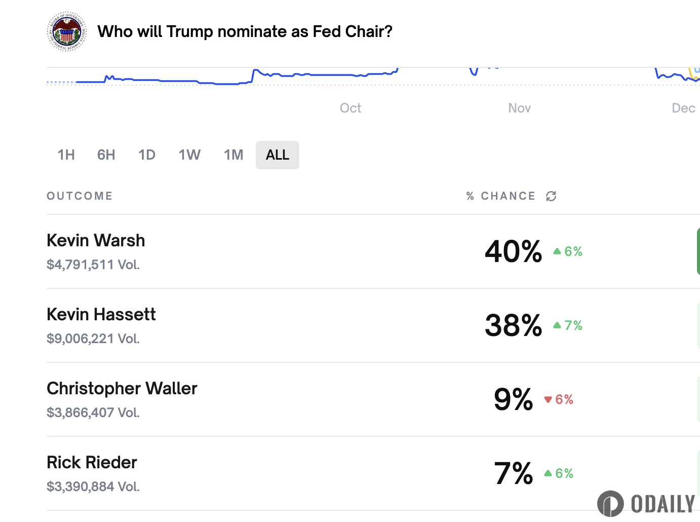 Odaily News: According to Polymarket data, the probability of Kevin Warsh being elected as Fed Chair is currently reported at 40% (up 6%), the probability of Kevin Hassett being elected as Fed Chair is currently reported at 38% (up 7%), the probability of Christopher Waller being elected as Fed Chair is currently reported at 9% (down 6%), and the probability of Rick Rieder being elected as Fed Chair is currently reported at 7% (up 6%).