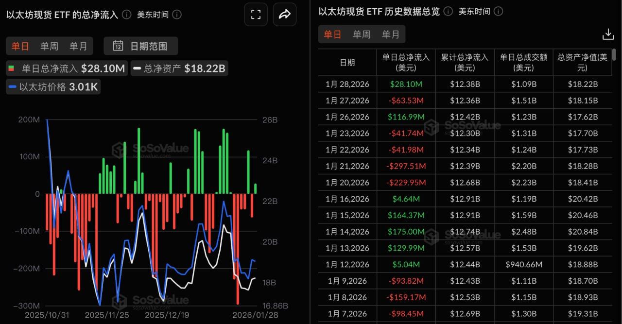 According to SoSoValue data, Ethereum spot ETFs recorded a total net inflow of $28.0951 million yesterday (U.S. Eastern Time, January 28).