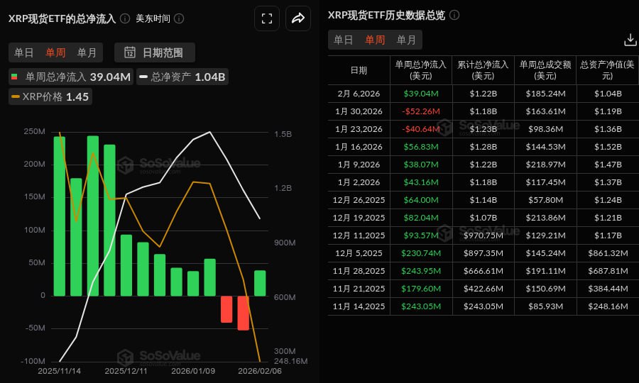 According to data from SoSoValue, the XRP spot ETF recorded net inflows of $39.04 million during last week's trading sessions (Eastern Time, February 2 to February 6).