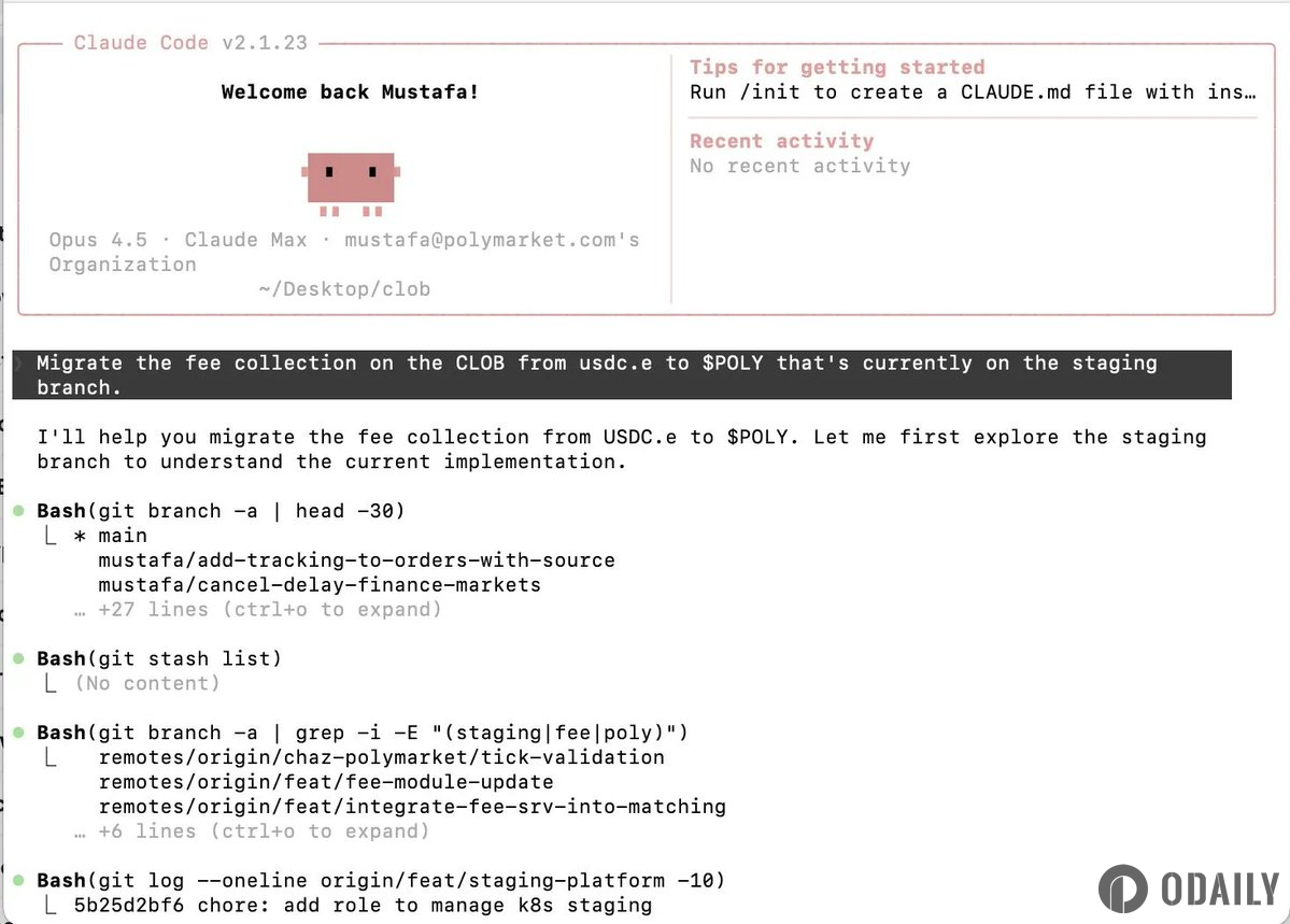 The image content was a screenshot of coding operations using Claude Code, with the task instruction being "Migrate the fee collection mechanism on the CLOB (Central Limit Order Book) from USDC.e to POLY; the current relevant code is located on the staging branch."