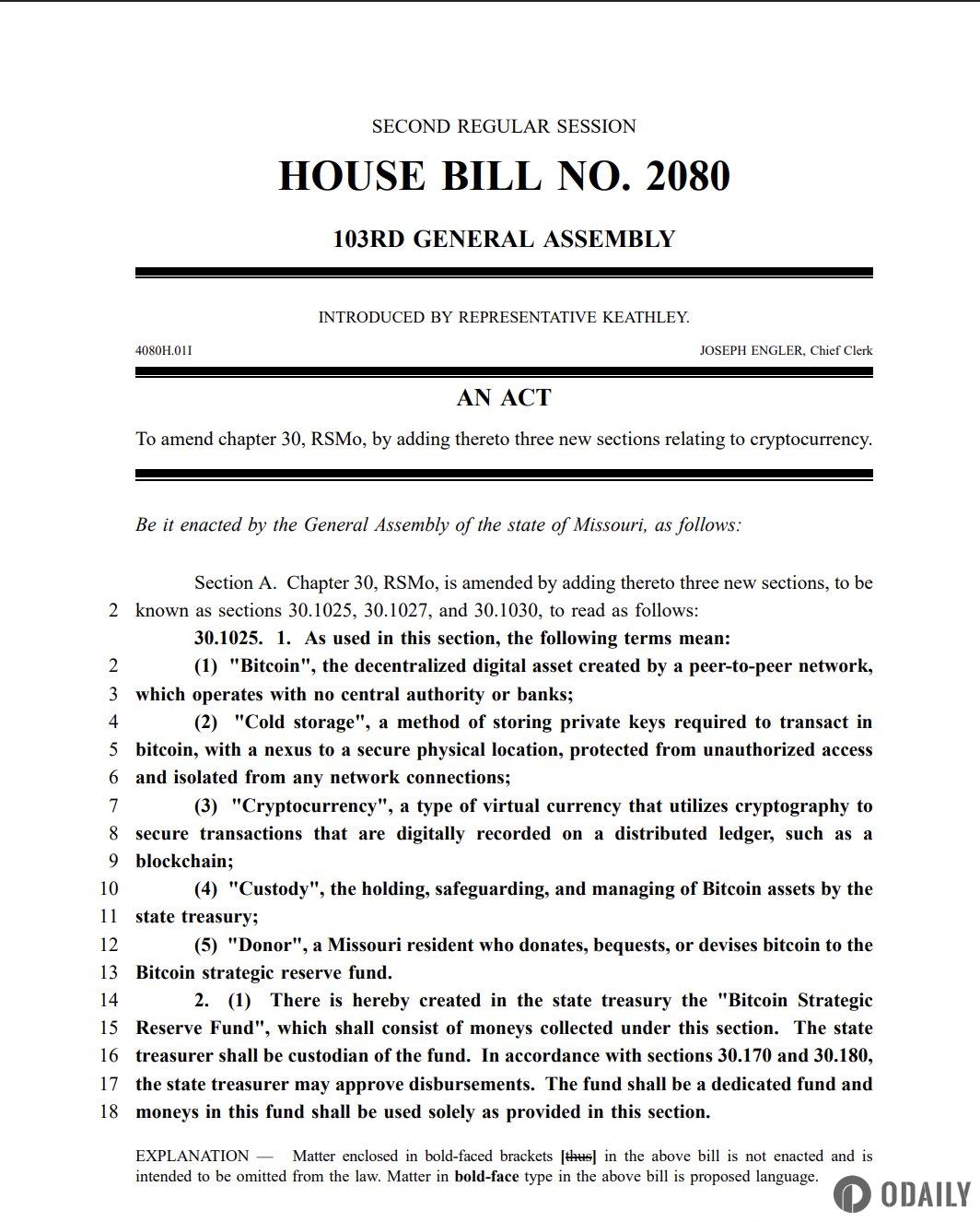 Odaily News Missouri's Bitcoin Strategic Reserve Fund Bill HB2080 has entered the review stage by the House Commerce Committee. If passed, the bill would authorize the Missouri State Treasurer to receive, invest in, and hold Bitcoin under specific conditions.