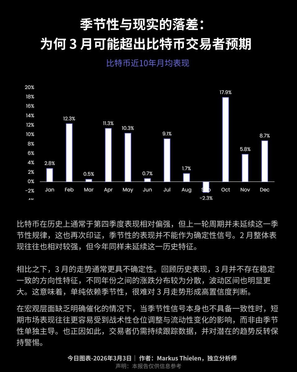 Odaily News Matrixport released a chart today stating that Bitcoin has historically performed relatively strongly in the fourth quarter, but the previous cycle did not continue this seasonal pattern, which once again confirms that seasonal performance cannot be taken as a definitive signal. February's overall performance has also tended to be relatively strong, but this year similarly did not follow this historical characteristic.