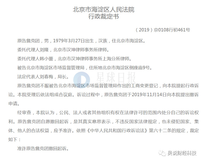 From the documents disclosed above, it can be seen that Ketuan Zhan immediately sued Beijing Haidian District Market Supervision Administration, which changed the legal person, to court, but immediately withdrew the lawsuit. People in the legal profession told Wu that the situation is generally that the judge tells the prosecutor that the probability of winning the case is almost zero, and it is recommended to withdraw the case by himself.