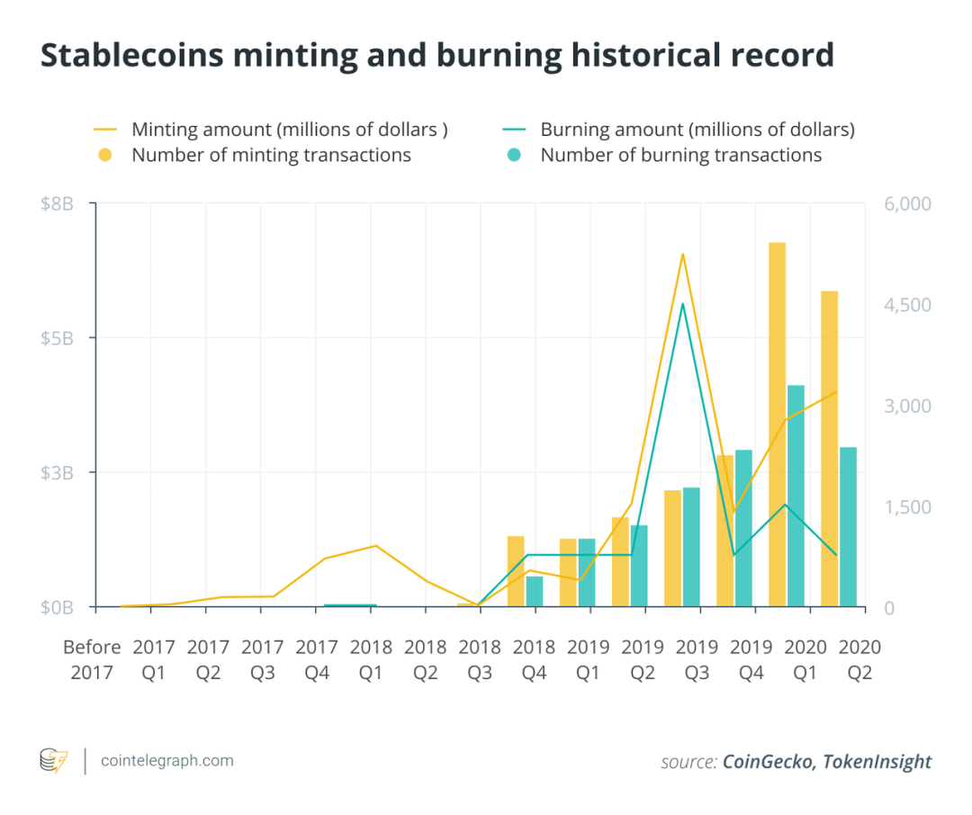 Check quarterly minting and burning records since early 2017. The dollar value minted and burned was at an all-time high in Q3 2019, and the number of minted and burned activity was at an all-time high in Q1 2020.