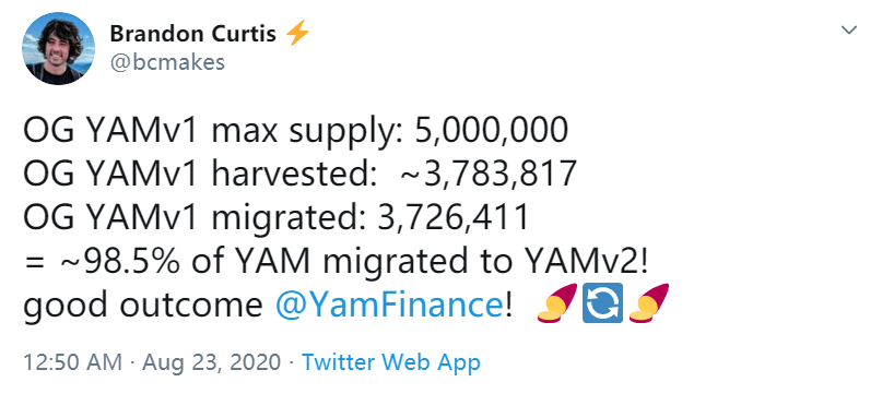 In the process of migrating from YAMV1 to YAMV2, the price of YAMV1 did not fluctuate greatly, and the transition was relatively smooth. In the mining pool 2 of YAMV1, $5 million of funds were not withdrawn from the mining pool until half an hour before the migration was closed. It was really digging out the last YAM and not wasting every YAM.https://poap.delivery/yam/secondary title