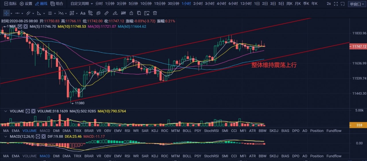 In terms of Bitcoin, it was still in an upward trend yesterday, rising from below $11,600 to above $11,800. Although it has not yet stabilized, it still has the strength to go up as a whole. Su Zhe said that based on last week's weekly pattern, if it rises in the first half of this week, the pressure on short positions will increase in the second half of the week, unless there is a strong financial force to pull up the funds. Now, from other hype concepts The flame-out funds seem to have nowhere to go, which instead gives us a hint of the market. Of course, we still focus on the current market. If we pull back first at the opening of the market today, the probability of a rebound within the day is still relatively high. We will pay attention to whether we can stand firm at $11,700.