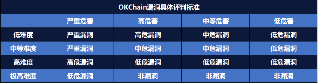 OKChain will classify vulnerabilities into five categories: "serious", "high-risk", "medium-risk", "low-risk", and "non-vulnerability" based on the characteristics of the vulnerability in two dimensions: degree of harm and difficulty of exploitation, supplemented by other comprehensive factors Levels, and correspond to different reward amounts.