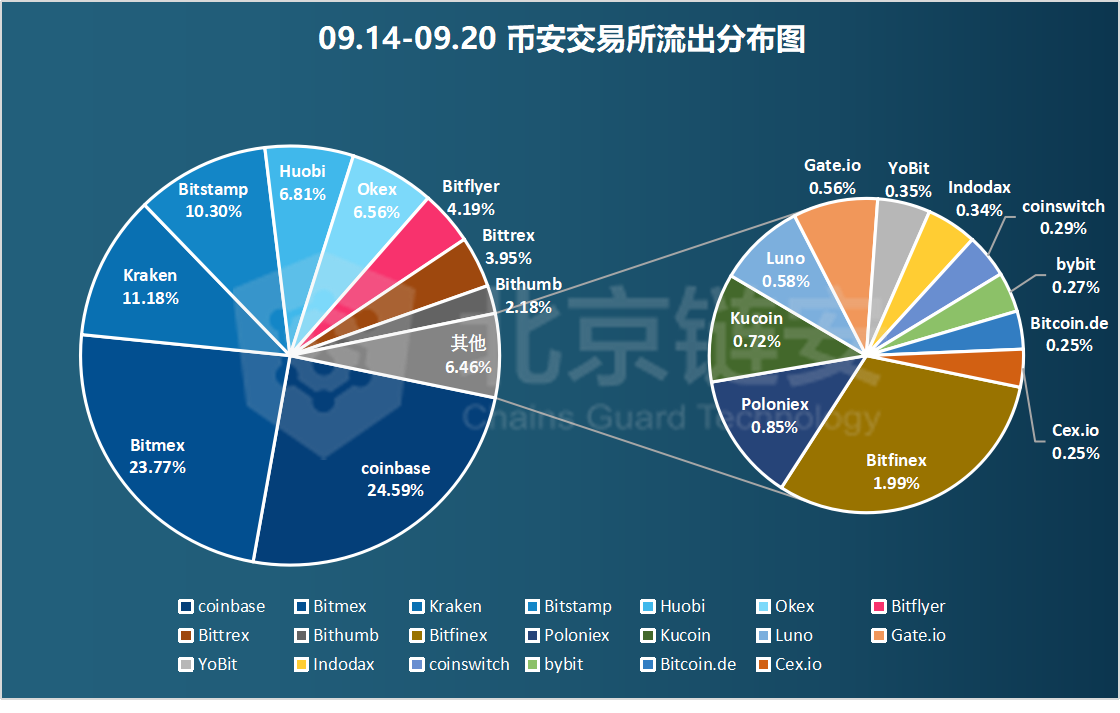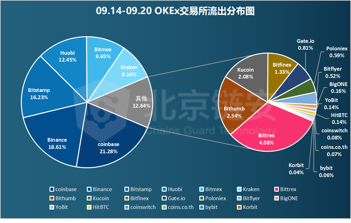 According to the outflow distribution chart, it can be seen that coinbase continues to occupy a large proportion of the outflows of the three major exchanges, but the shadow of Kraken appeared in the top three outflows of Binance Exchange this week, if this does not represent a new If there is a trend, then it is very likely that there was a transfer of large accounts from Binance to the exchange last week, and we need to further observe the data of the next week. From the perspective of Huobi, the largest exchange for outflows has once again turned to Binance, followed by Coinbase and Bitmex. The whereabouts of Bitcoin on the OKEx exchange is worthy of attention. Bitstamp, whose proportion has increased significantly in the past three weeks, has already ranked among the top three this week.