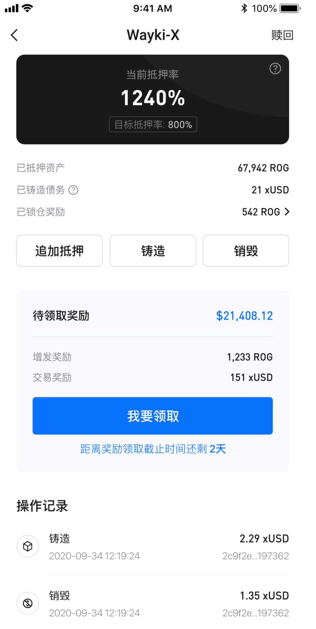 (4) Receive rewards: Only when the mortgage rate is guaranteed to be 800%, can you receive additional issuance rewards ROG and transaction rewards xUSD. If it is lower than this 800%, there is no such thing as liquidation, but you are not eligible to receive rewards. Generally speaking, in order to ensure that rewards can be received every time, the general mortgage rate should be higher than 800%.
