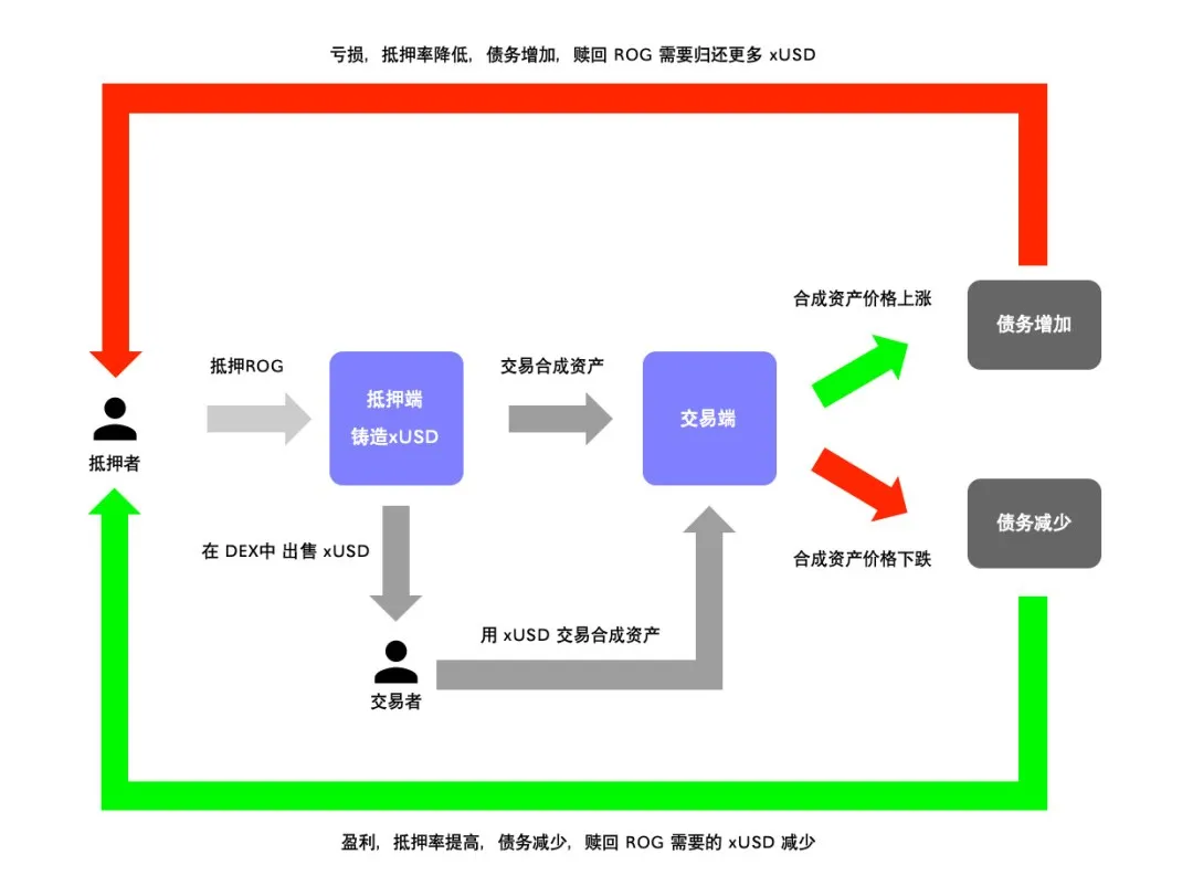 1. Issuance of synthetic assets: Mortgageers mortgage ROG at a mortgage rate of 800% to generate xUSD, a stablecoin synthetic asset. This process is relatively simple, but behind it involves many more complex mechanical issues.