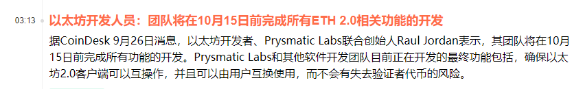 The brighter part today is related to Ethereum. According to the developers of Ethereum, the team will complete the development of all ETH2.0 related functions before October 15.