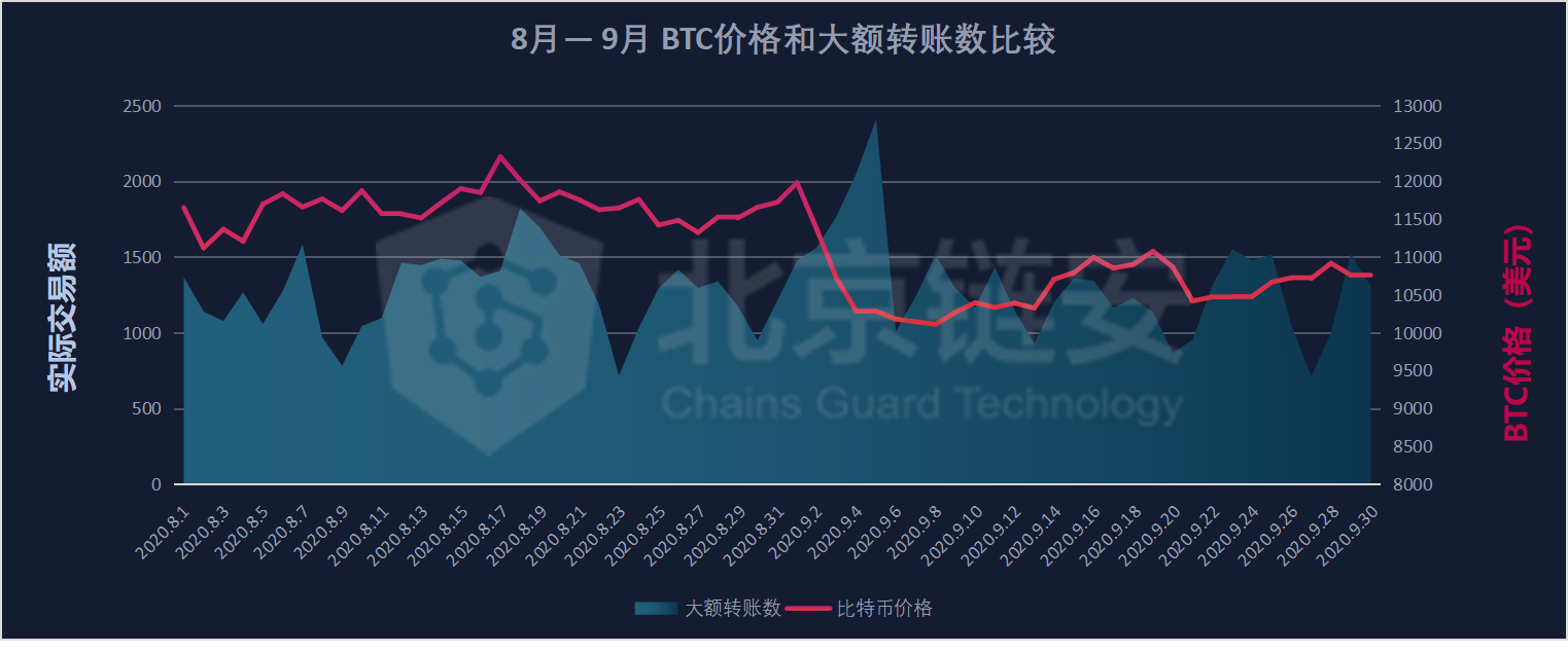 From the comparison with the price of Bitcoin in the same period in August and September, in the price dive stage in early September, large-value transactions were frequent, but after the currency price stabilized at 10,000 to 11,000 US dollars, the number of large-value transfers did not fluctuate significantly, reflecting the Regarding Bitcoin transactions, exchange users did not have too frequent transactions during the currency price shock period.