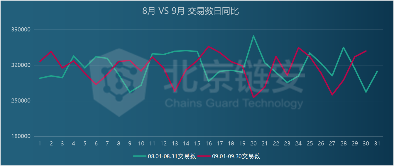 From the comparison of the number of transactions on the chain and the price of Bitcoin in the past two months, the fluctuation range is not large, and there is an overall downward trend in September.