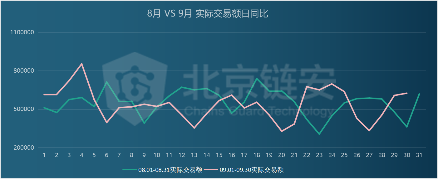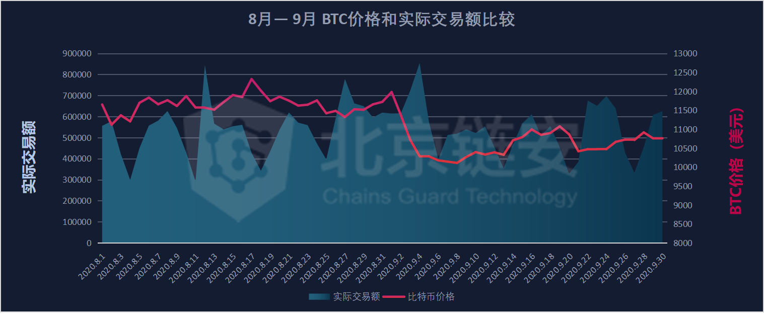 From the comparison of Bitcoin price and transaction volume in the past two months, in terms of actual transaction volume, it basically fluctuates with currency price fluctuations, and has no direct relationship with the absolute amount of price. In the stage of Bitcoin price diving, the actual The transaction volume is larger. Obviously, in September, due to the impact of the renBTC pledge address, the relationship between transaction volume and Bitcoin price was distorted.