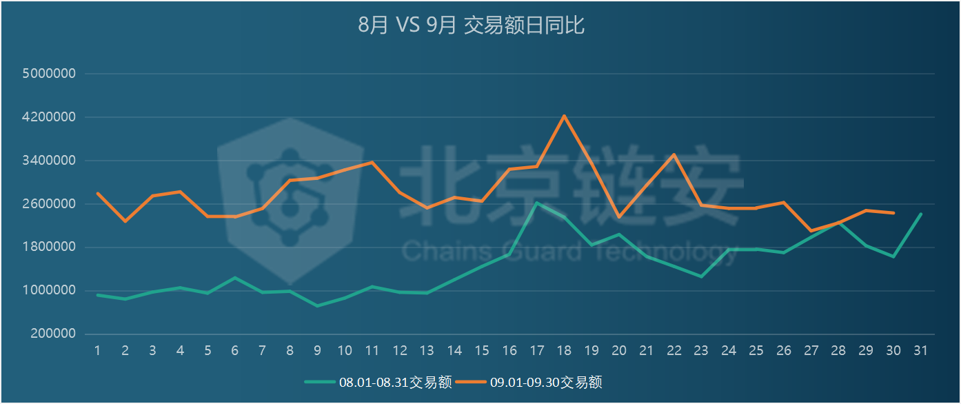 In September 2020, the transaction volume on the Bitcoin chain was 83,577,456.2 BTC, an increase of 84.75% compared to 45,239,000.92 BTC in August 2020.