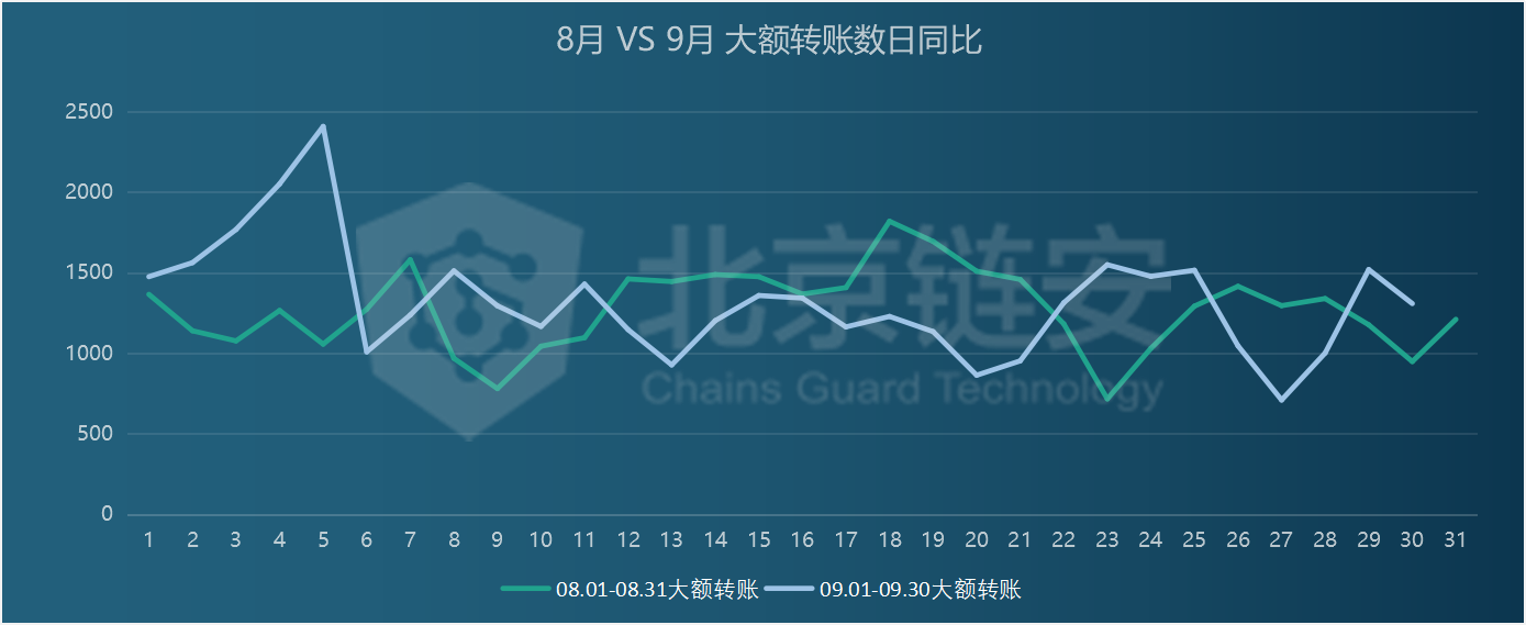 In September 2020, the number of large-value transfers on the chain was 39,660, an increase of 0.78% from 39,367 in August 2019
