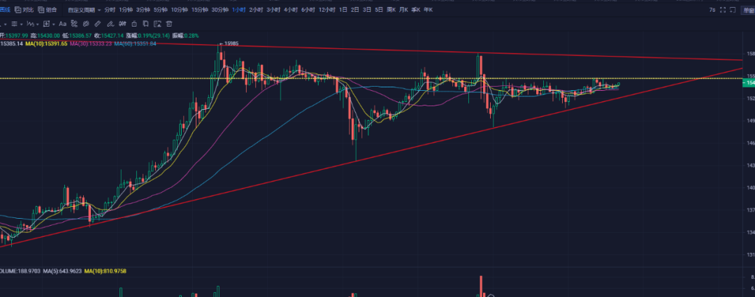 The lower support level is still the lower track of the same triangular range. After the range is narrower, the duration of the shock will be shorter. First break through the small triangular range and then expand. As yesterday's bottom did not fall below $15,000, the current low It is also getting higher and higher. As long as each subsequent bottom does not fall below 15,000 US dollars, it is only a matter of time before it continues to rise.