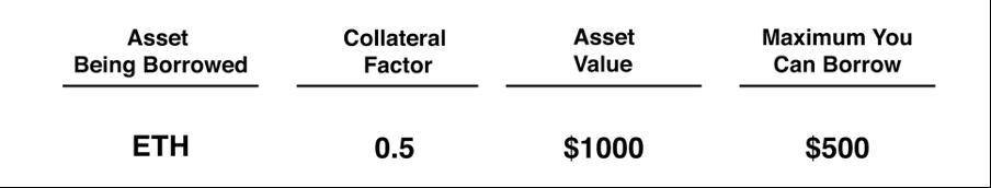 The amount a user can borrow is determined by a collateral factor ranging from 0 to 1. A Collateralization Factor (CF) of 0.7 equals 70% of the value of the underlying asset that users can borrow. Below is an example of how much a user can borrow with a CF value of 0.5.