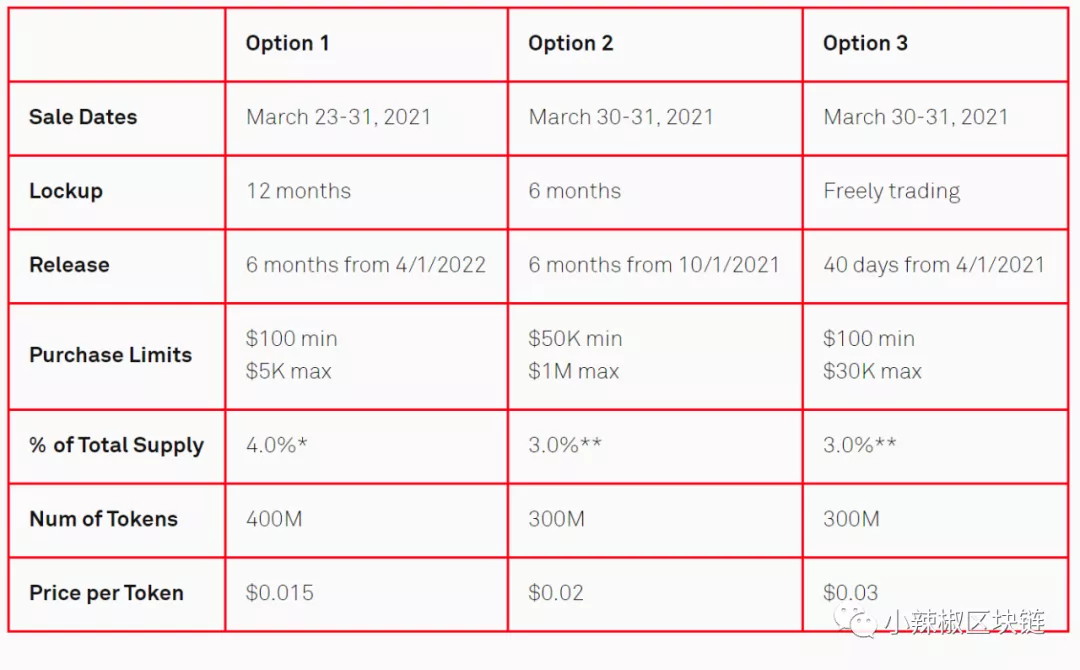 Roughly speaking, the first option needs to be locked for 12 months, and the private placement price is 0.015 US dollars per piece; the second option needs to be locked for 6 months, and the private placement price is 0.02 US dollars per piece; the third option has no lock-up, The private placement price is US$0.03/piece.Brothers need to note that project tokens are supplied on demand:First, option 1 may increase supply to 8.0% based on expected demand. This decision will be made and announced no later than 13 March 2021;Second, the supply of options 2 and 3 could increase to 4.0%, again based on expected demand. This decision will be made and announced no later than March 13, 2021.The figure below shows the details of the 3 options:Brothers who plan to participate can register on the official website and prepare KYC information. Let me make a joke, everything is expensive in the bull market, and now the price of overseas KYC has doubled.