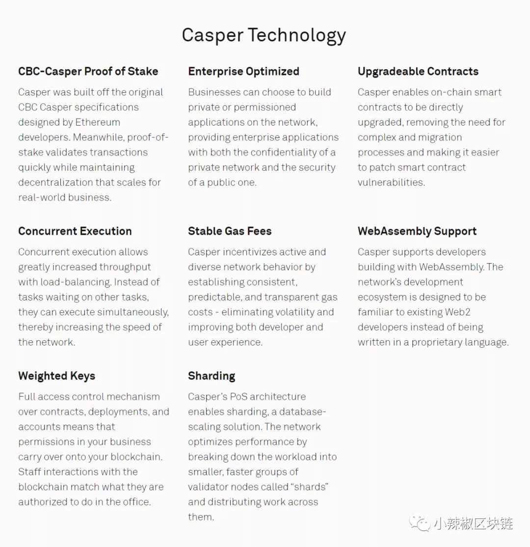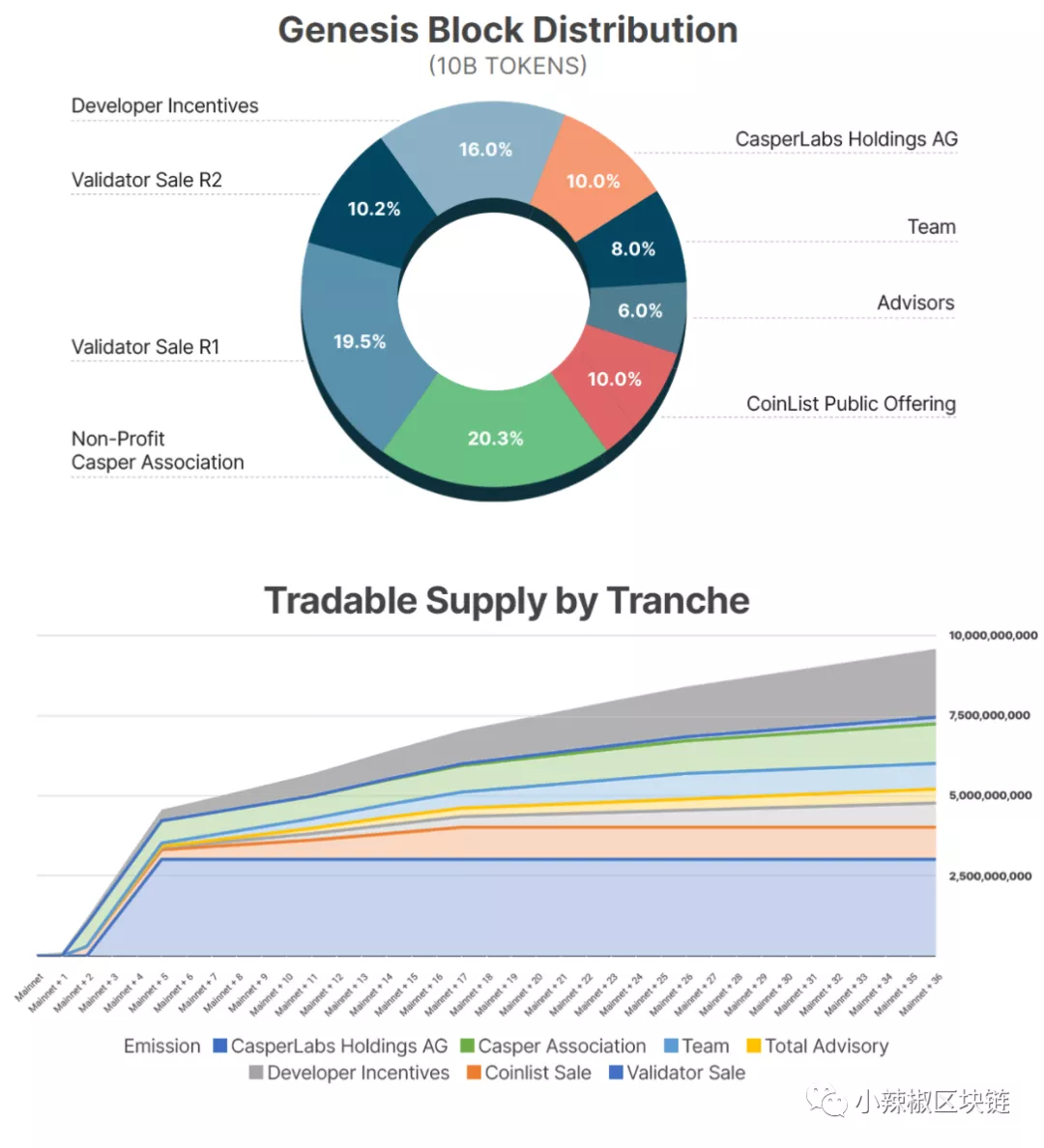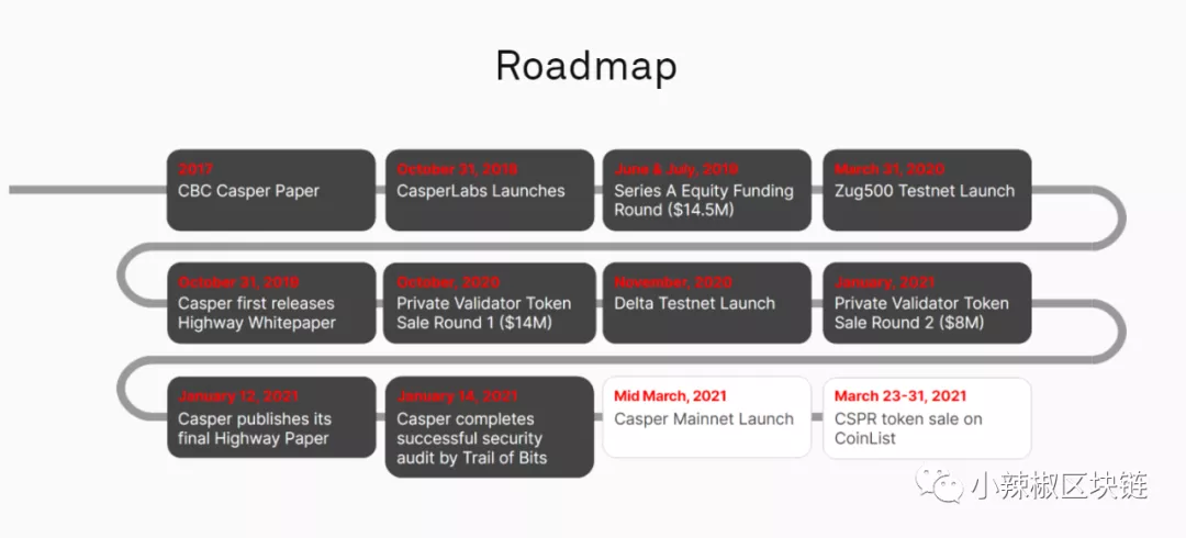 In accordance with laws and regulations, tokens will be distributed as follows:The benefits of staking include three aspects:The initial reward is 15% of the annual income before the launch of the mainnet. For Stkaing rewards, the agreement sets the target at a total yield of more than 15% in the first year after the mainnet is launched.Casper uses a Highway protocol, and its failure is easy to detect. The penalty mechanism is that if a validator proposes two different blocks at a time, or uses multiple parent blocks as the reason for the block, the validator pledges will be slashed, and its influence will be weakened, so the normal functioning nodes will also get greater rewards.In terms of financing history, the official data of the Casper project has gone through 3 rounds of financing:The first round of equity financing in July 2019 was led by Terren Piezer, with participation from Consensus Capital, Digital Strategies, etc., and raised a total of 14.5 million US dollars.The main participating institutions are domestic and foreignThe second round, the first token financing in September 2020, raised a total of 14 million US dollars. At that time, the price was USD 0.0100/CSPR, and the condition was that a 3-month pledge period was required from the mainnet launch, followed by a 3-month unlock release period.The third round, the second token financing in January 2021, raised a total of 11.9 million US dollars. At that time, the price was USD 0.0150/CSPR, and the condition was that a 3-month pledge period was required from the mainnet launch, followed by a 3-month unlock release period.Checking the information two days ago, Fatty found that several domestic second- and third-tier exchanges have also invested in this project, and some other capitals with Chinese backgrounds have also participated.If you want to characterize it according to the capital background, Fatty can think that this is a "Sino-foreign joint venture" public chain, and it cannot be regarded as a purely foreign public chain. If you participate, you should consider carefully the release time of tokens and the listing time. Play short term, run fast, direct option 3.Technically, Casper is built on the original CBC Casper specification designed by Ethereum developers. Eight technical features are listed on the official website, such as CBC-Casper-based POS protocol, enterprise-level optimization, upgradeable smart contracts, concurrent execution, stable gas costs, WebAssembly support, weighted keys, sharding, etc.In terms of the number of validators, CasperLabs has 21 nodes participating, including some staking mining pools, such as: HashQuark, SNZ Pool, Stakefish, Acheron, RU Validators Club, The Arcadia Group, UABWebas.It, Morrestyn, LedgerLeap, DelightLabs, StratX, BlockBlox, along with several other independent validators from the CasperLabs community.It is said that the highlight of this project is the Highway protocol innovation. I found an article and copied a paragraph:"Highway supports fast and slow lines, corresponding to fast verifiers and slow verifiers. Verifiers can propose blocks at different time intervals according to their own system performance and network connection speed. Activity is achieved by supporting leader nodes and dynamic rounds. and time window, if a node fails to send messages for two consecutive rounds, then the node will be considered under attack.”https://github.com/CasperLabs/highway/releases/download/v1.0/highway.pdfThe specific protocol content can be found in the github paper: