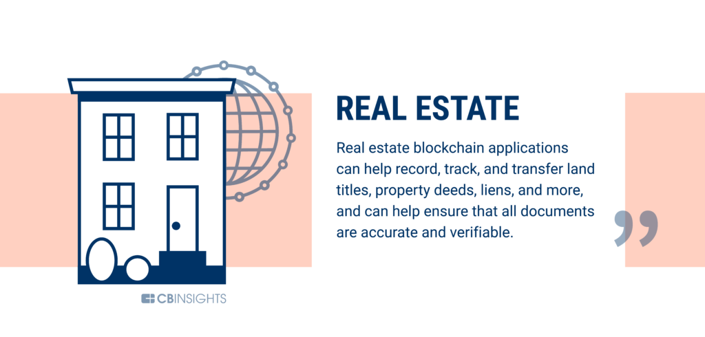 Real estate blockchain applications can help record, track, and transfer land titles, real estate deeds, liens, and more, and help ensure that all documents are accurate and verifiable.