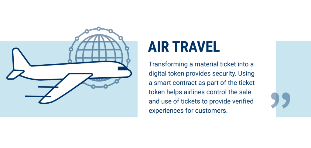 Applying blockchain technology to secure and coordinate this data could make travel safer and more convenient for travelers. Converting paper tickets to digital tokens takes security to a new level. Using smart contracts as part of the ticket can help airlines control the sale of tickets and provide verification for customers, and can also be used to create more accurate aircraft maintenance logs, prevent overbooking, and more.