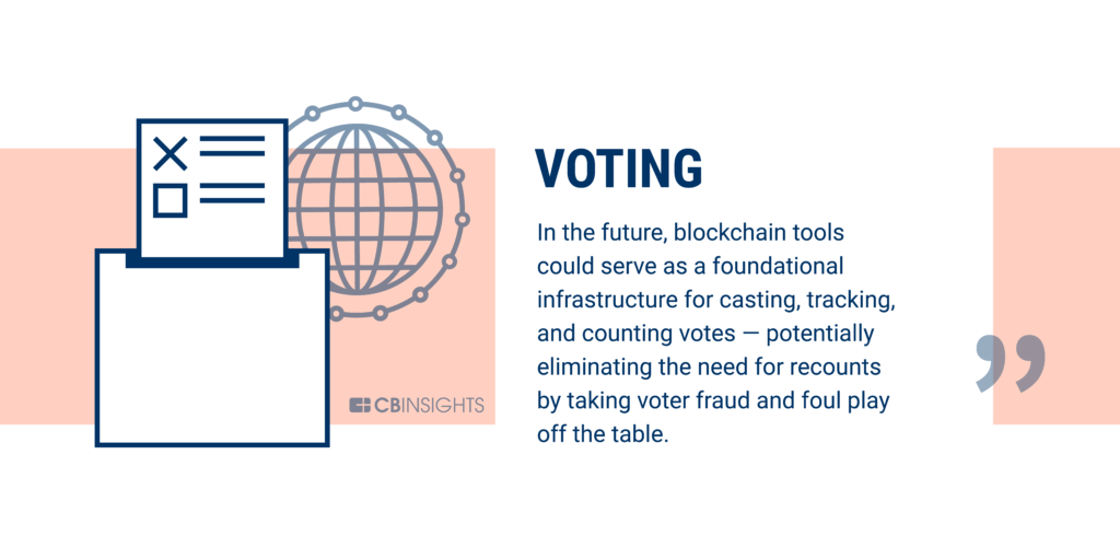 Elections require voter identities to be authenticated, ballots to be securely recorded, and victors to be determined through credible statistics. In the future, blockchain tools can serve as the infrastructure for voting, tracking and counting votes. By eliminating voter fraud and spoofing, it is possible to avoid the need for recounts.