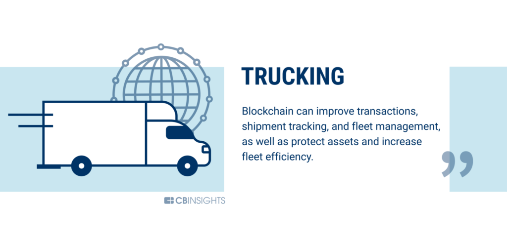 Blockchain can improve transactions, shipment tracking and fleet management to protect assets and increase fleet efficiency. It could help track contamination issues in the food supply chain, for example, by tracking a truck loaded with ingredients, noting whether safe storage conditions were maintained during any delays. Additionally, it can help optimize routes by matching truck drivers with items to be trucked in a certain area.