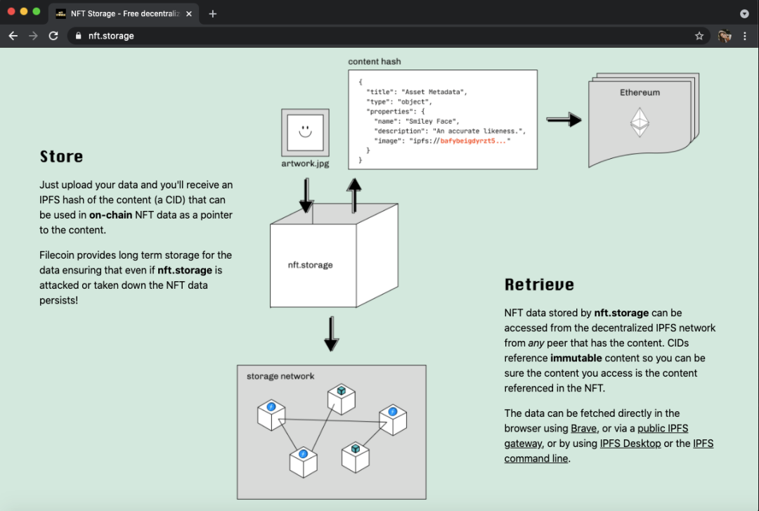 NFT.Storage makes it easy, secure and free for developers to store NFT data on a distributed network. With just a few lines of code, anyone can leverage the power of IPFS and Filecoin to ensure the persistence of their NFT.