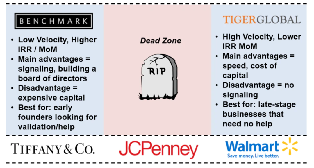 The gradual rise of individual GPs: How does venture capital win in the entire industry? Everett Randle made some points in the article "Playing Different Games": A venture capital institution can choose to become a star venture capital institution (such as Benchmark) or a low capital cost fund (Tiger), but if it is in the middle position , it may be more troublesome, as shown in the following figure: