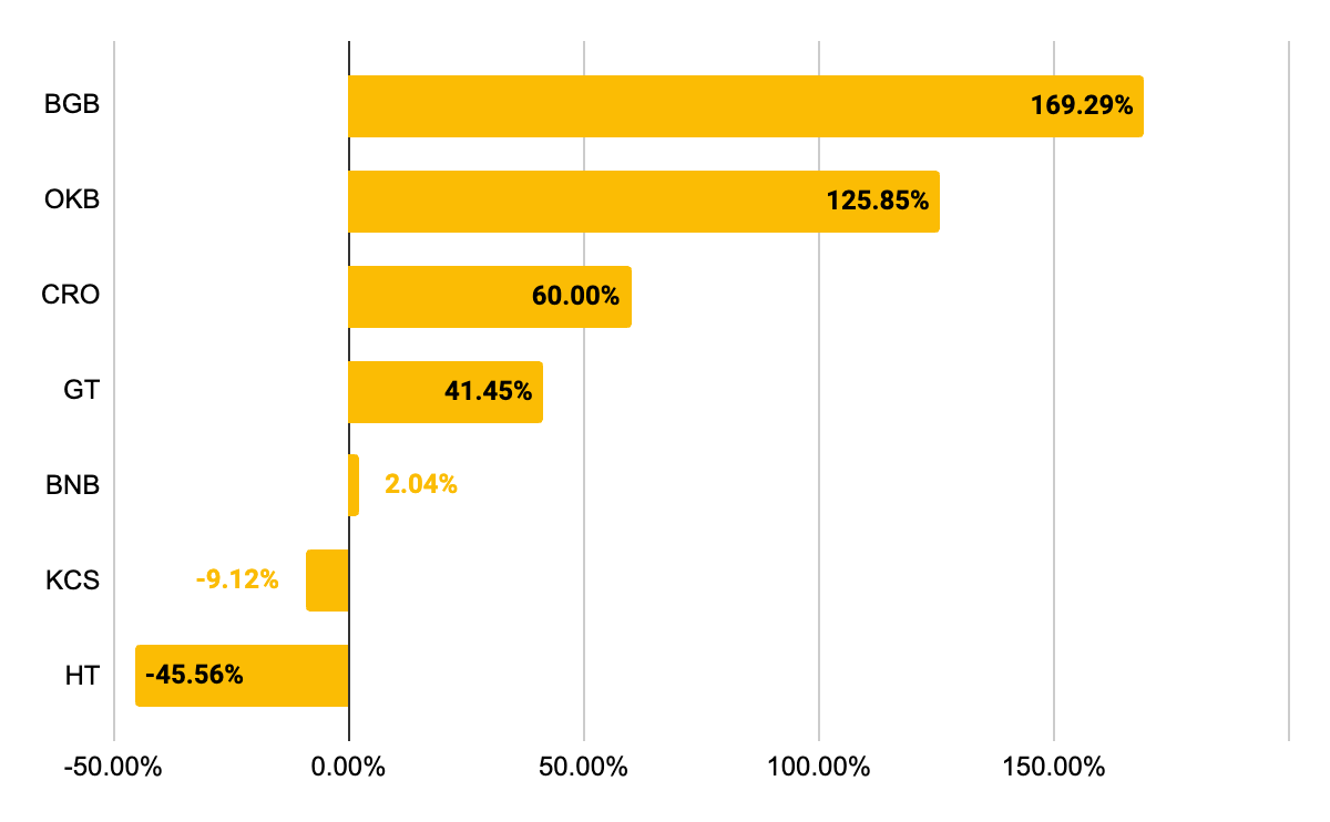 The price trend of platform coins is the most intuitive indicator reflecting its investment potential. It can be clearly seen from the chart below that BNB, as the industry leader, has achieved a 2% increase this year, and the operating conditions of the platform directly affect the price of the platform currency. Similarly, we can also see this view being verified among the outstanding performing currencies. The Bitget platform, which has emerged rapidly in 2023, is an example. Its platform currency BGB has risen by 168% since the beginning of this year. This increase has even exceeded Bitcoin (BTC has increased by 107% from the beginning of the year). BGB has become one of the best-performing platform coins this year, and it is also one of the few platform coins that can surpass Bitcoin in terms of growth.