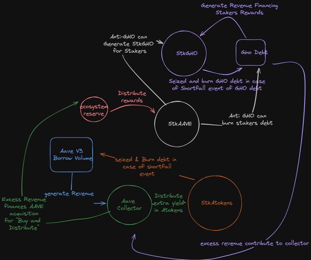 3. Cancellation of GHO lending rate discount and introduction of Anti-GHO token: Anti-GHO is a non-transferable ERC-20 token. Users accumulate Anti-GHO linearly, and the generation of Anti-GHO is proportional to the interest accumulated by all GHO borrowers. StkAAVE holders can destroy Anti-GHO to mint GHO to repay their own GHO debts or receive StkGHO, thereby enhancing the consistency of interests between AAVE pledgers and GHO borrowers, and introducing revenue sharing of part of the Aave protocol revenue to some AAVE pledgers.