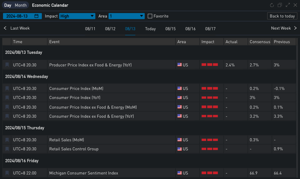 Yesterday (13 August), the US PPI rose 2.2% year-on-year in July, lower than expected, and also fell sharply compared with the previous value. Before the release of CPI today, traders increased their bets on the Fed's easing policy. The 10-year Treasury yield is now at 3.838%, a recent low, and the two-year yield fell below 4% to 3.941%. Boosted by this, US stocks collectively closed higher (Dow +1.04%, S&P +1.68%, Nasdaq +2.43%), helping BTC break through 6 w (closed at $60874, +2.75%), and ETH stood above $2700 (closed at $2725, 2.75%).