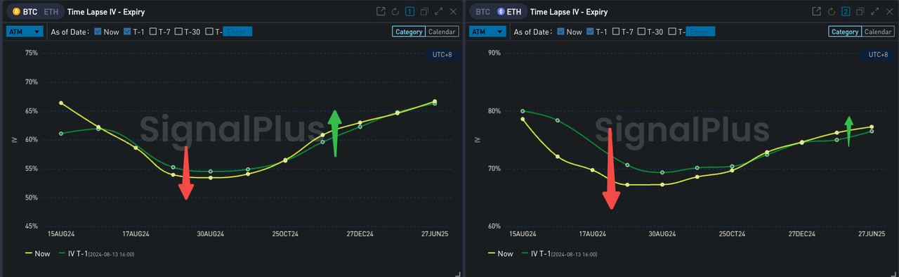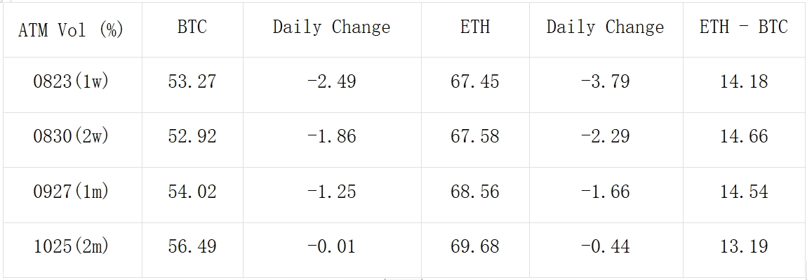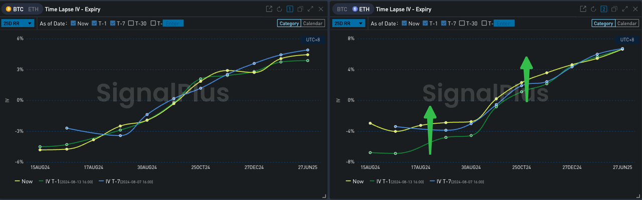 As the price of the currency rises, the volatility curve has steepened again. Specifically, the release of PPI data has eliminated some uncertainties. The IV of the middle and front ends (especially ETH) has dropped significantly, but the IV of the end of the day still enjoys a higher Vol Premium due to tonight's CPI data. The far-end IV has risen slightly, and some Top Side buying can be seen from the transaction. From the perspective of Vol Skew, ETH's RR continues to rise overall. The day before yesterday (August 12), Grayscale's ETHE ended the outflow of funds for the first time, becoming an important turning point. The overall ETF has also received positive inflows for two consecutive days, providing support and confidence for ETH's currency price, allowing it to break through the two lines of defense of 2600 and 2700 in succession, and challenge 3000 again.