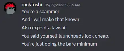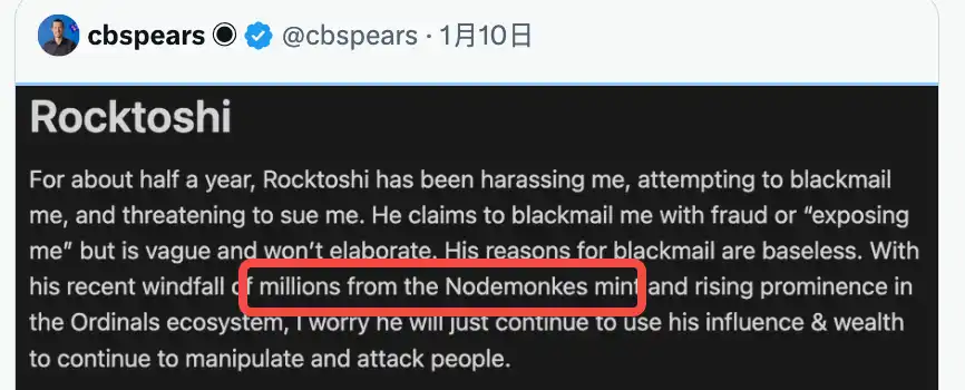 For example, Charlie @cbspears, the maintainer of Ordinals Hub, publicly posted in January this year that "Rocktoshi has been harassing me, trying to blackmail me, and threatening to sue me for the past 6 months";