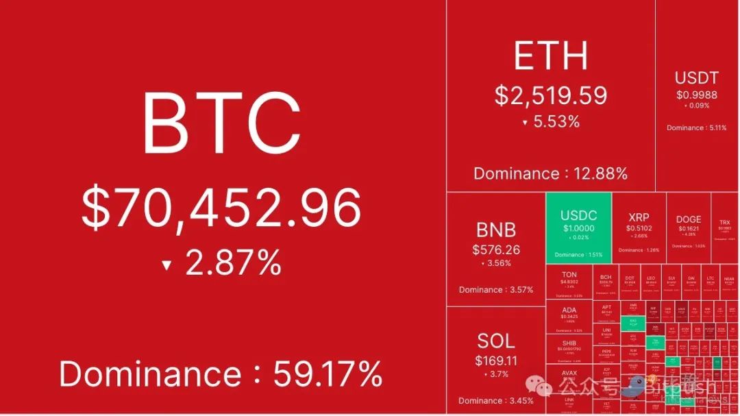 According to Bitpush data, Bitcoin fell below the $72,000 support level near midday, and then fell below $70,000. As of press time, Bitcoin was trading at $70,452, down nearly 3% in 24 hours.