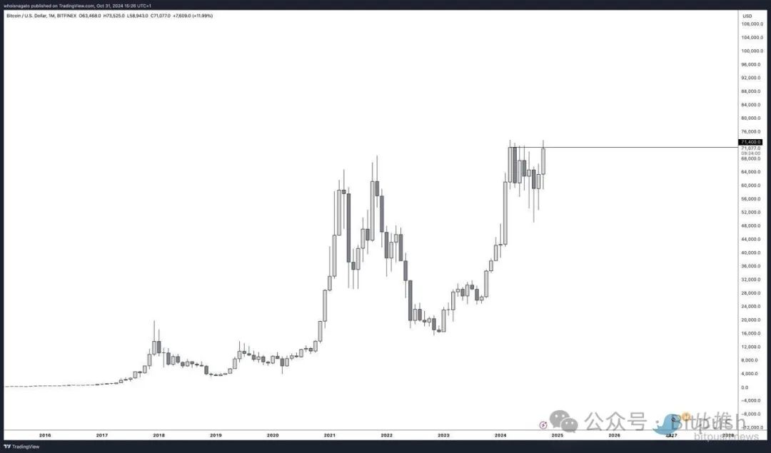 Looking at the overall performance this month, Bitcoin crashed to a low of $58,855 on October 10, but then started a rebound, rising to near its all-time high, with the current 30-day increase of about 16.08%. According to market analyst Nagato, a closing price below $71,400 this month would mean "failure."