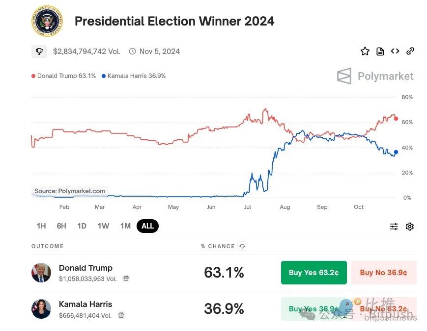 Data from crypto betting site Polymarket showed that Trump's chances of winning dropped to 63% from 67% two days ago, while Democratic candidate Kamala Harris's chances of winning rose to 36% from 33%.