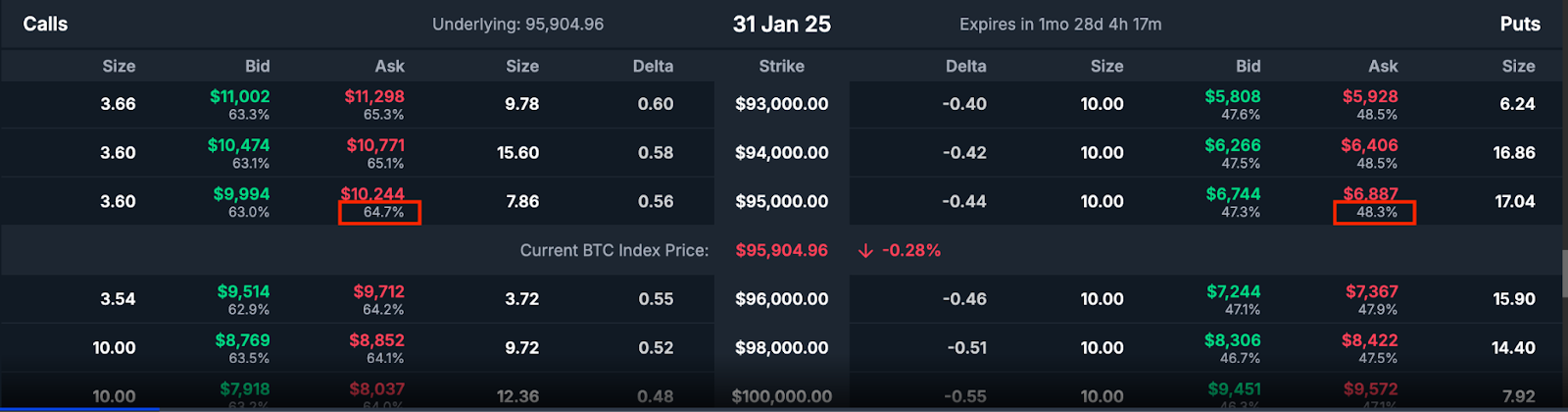 As shown in the above BitMEX options table for BTC options expiring on January 31, 2025, the IV skew between call and put options is about 25%, with the IV of call options being significantly higher.