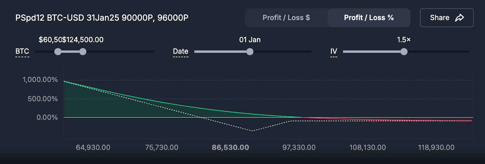 BTC falls sharply: Significant downside price action amplifies the value of the $90,000 put option, while the $96,000 put option offsets the cost.