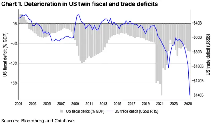 This article is compiled from the latest monthly outlook research report released by Coinbase. The report points out that as the US "twin deficits" continue to expand and trade protectionism intensifies, market confidence in the US dollar continues to weaken, and the world may usher in a round of large-scale asset portfolio reconstruction. In this context, Bitcoin is being regarded by more and more countries as a potential supranational reserve asset because of its sovereign neutrality and freedom from capital controls. According to the conservative estimate of the report, if Bitcoin is gradually included in the global reserve system, its total market value is expected to increase by about US$1.2 trillion.
