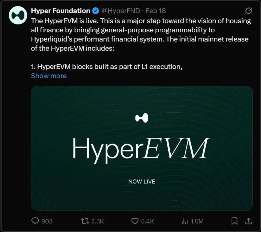 From perpetual contracts to spot trading, all of Hyperliquid's products are built on its custom blockchain - Hyperliquid Layer 1. On February 18, 2025, HyperEVM was officially launched on the mainnet.