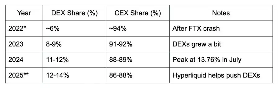 2022 refers to the period after the FTX crash (November to December). 2025 data is an estimate as of March 6. Hyperliquid is aware of this shortcoming: if the user experience is poor or liquidity is insufficient, users will not migrate to the chain in large numbers. Therefore, the team is committed to creating "CEX-level speed and liquidity, but completely on-chain."