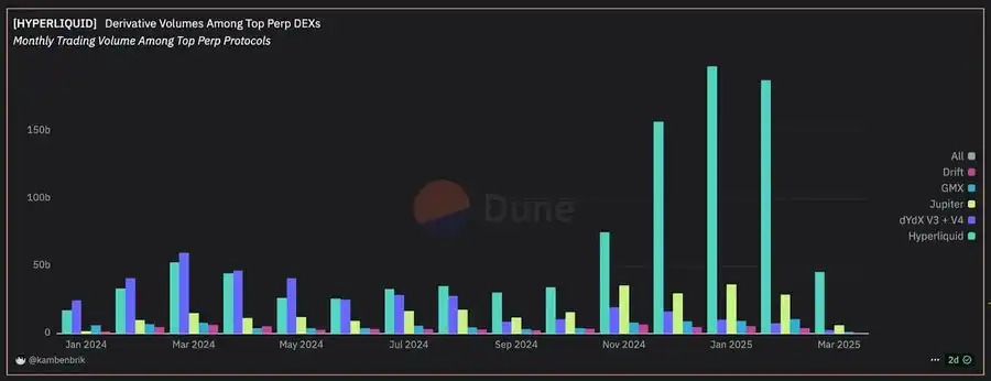 As of February 2024, Hyperliquid has accounted for 56% of on-chain derivatives DEX trading volume. Since July 2024, its monthly perpetual contract trading volume has surpassed its main competitors. In January 2025, Hyperliquid's monthly perpetual trading volume reached US$196 billion, while the other four major protocols totaled only US$60 billion.