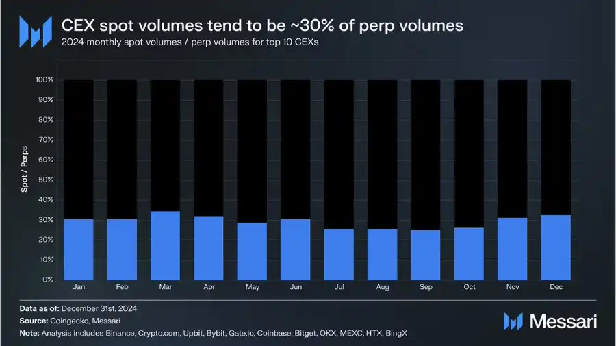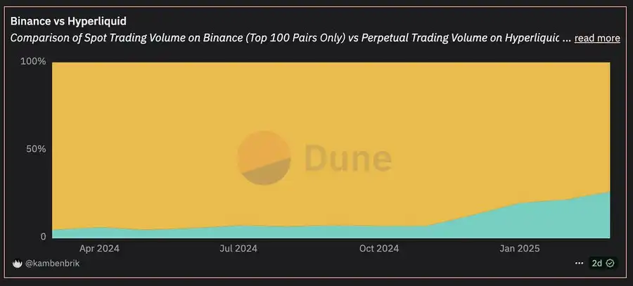 Volume Gap and Growth Trajectory · While Hyperliquid is still smaller than top CEXs like Binance, it has closed the gap in some months, and by March 2025, it accounted for more than 26% of the total volume displayed (compared to Binance's top 100 spot pairs). This comparison highlights that an on-chain high-performance perpetual swap exchange can effectively challenge and even dominate centralized spot markets.