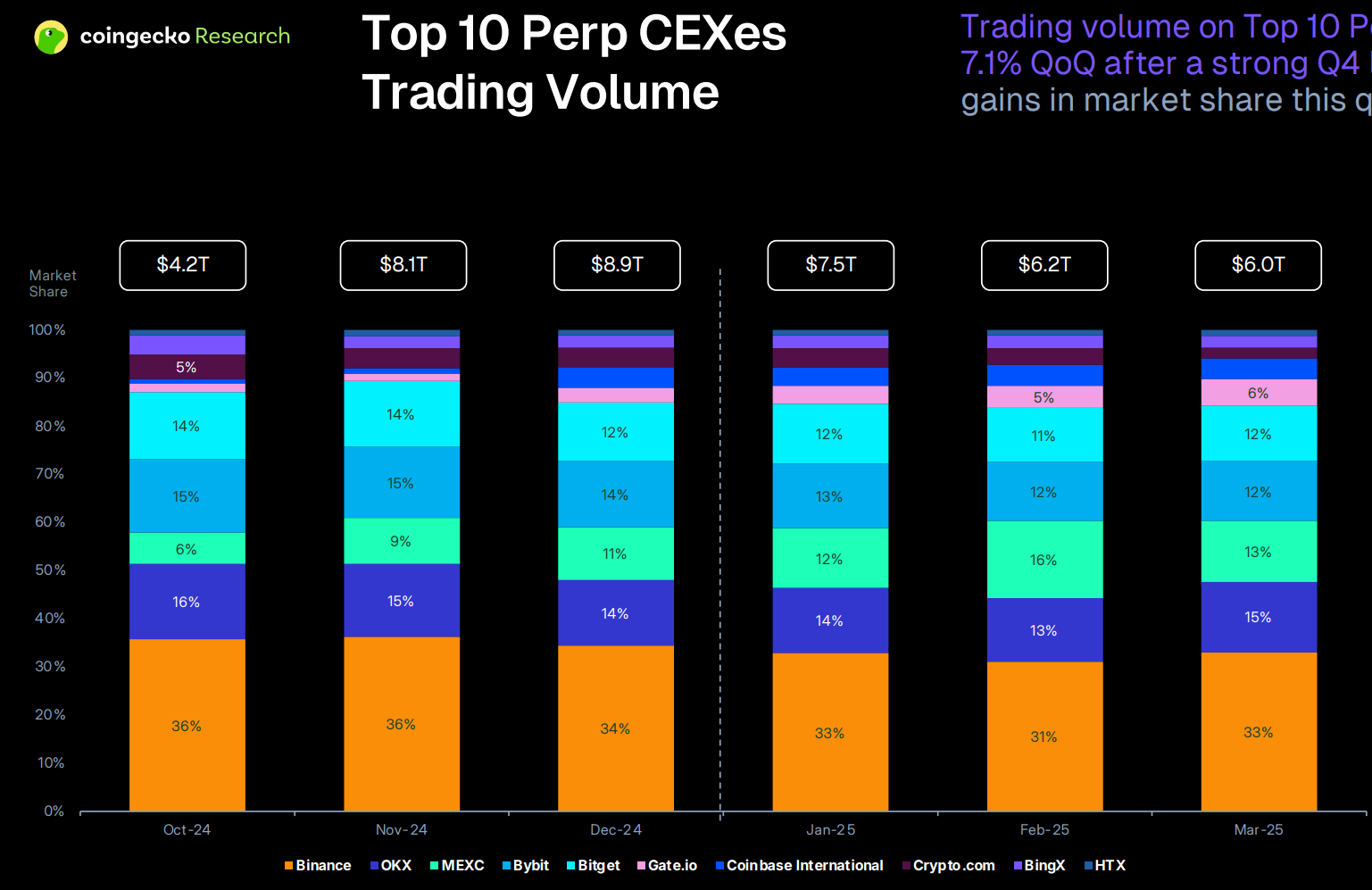 In the field of crypto trading, perpetual contracts are a high-profit area and a sensitive area for regulation. According to the Q1 2025 report released by Coingecko , the cumulative derivatives trading volume of the top ten trading platforms in the world reached 19.7 trillion US dollars, three times that of the spot market. Binance occupies about 32% of the market share, while Coinbase International only accounts for 5%.